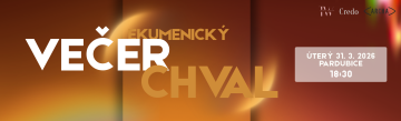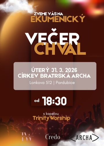 Zveme vás na ekumenický večer chval v úterý 31. 3. 2026 od 18.30 ve sboru Církve bratrské Archa v Pardubicích.