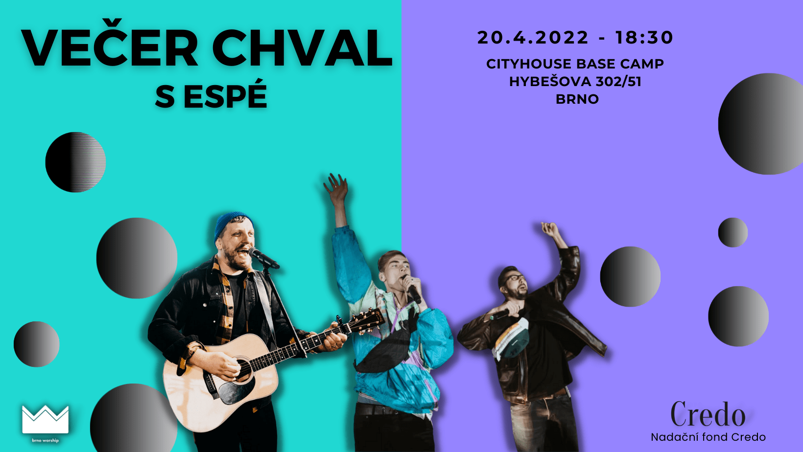 Večer chval s kapelou ESPÉ v Brně se konal 20. dubna 2022. Kromě povzbuzení od Jula Slováka si účastníci poslechli i silný příběh CityHouse Brno, jak se z nočního klubu stala církev.